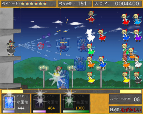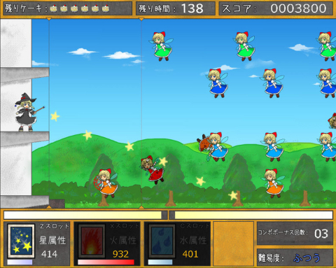様々な魔法を駆使し、ケーキを奪いに来る妖精たちを退治するゲームです